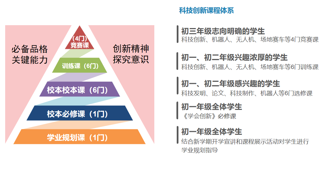 科技中学是一所以科技创新教育为办学特色的公办初级中学,我们因地制宜自主研发的校本课程《学会创新》,以科技创新为重点内容,九年级每班每周一课时。学生在创新课上学习创新的技能和方法,训练创新的思维和品质,然后,通过综合实践活动,加深理解,培养动手实际操作能力。在此基础上学校还开设了多类别、多方向科技类校本选修课,内容包含:科技发明、科技论文与科技实践活动、科技制作、机器人、编程、无人机操作等,打造AI赋能教育环境下的科技创新课程体系。在这一系列课程中我们采用“七步式”教学方法,以问题作为驱动,启发学生发现问题;以AI作为手段,赋能学生研究问题,解决问题;以评价作为指引,引导学生进步。