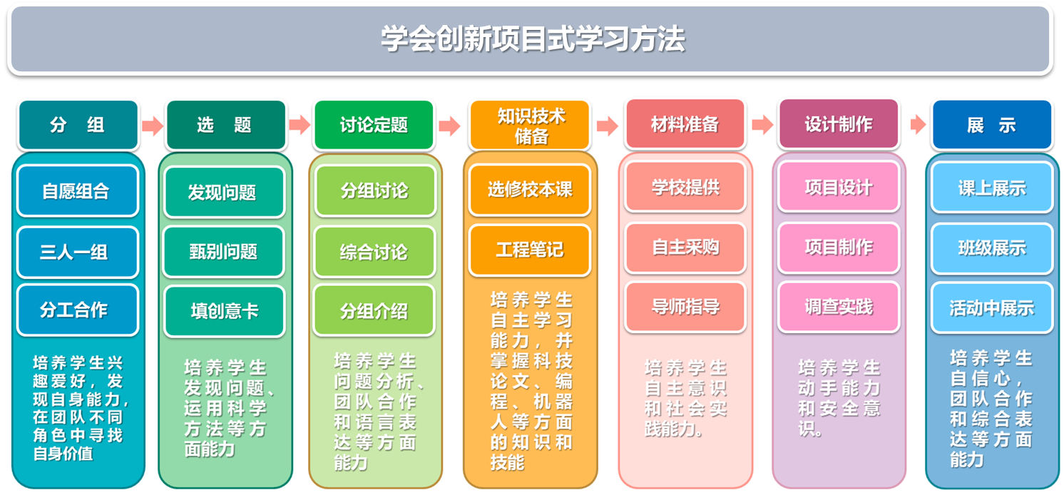 教师指导学生通过“发现问题、研究问题、解决问题”等环节学习和小组合作方式,自主开展科学考察和研究,引导学生“带着发现问题的思考去解决问题”,整个项目学习过程分为分组、选题、讨论定题、知识和技术储备、材料准备、设计制作和展示等七个环节(如上图所示):